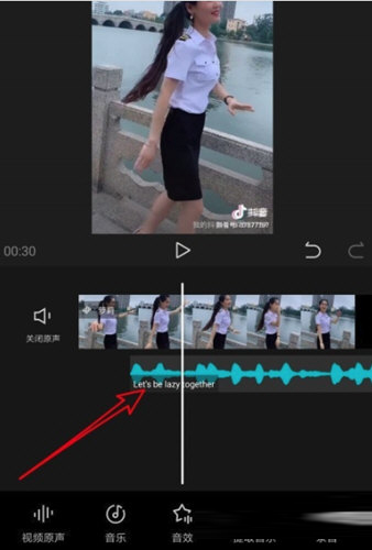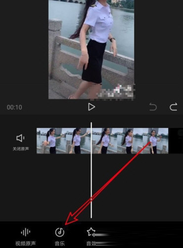 2、进入到视频编辑界面之后,我们点击选中视频素材,这时候即可在下方出现一个功能列表,在列表中选择“音乐”。