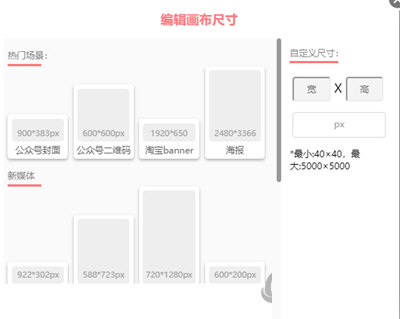 2、在设置画布尺寸大小界面中可以看到各种类型的尺寸推荐,满足淘宝商家、微信公众号自媒体工作者等的需求,可以快速生成符合条件尺寸图片。