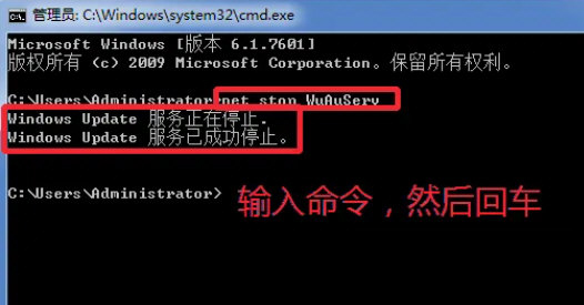 然后在命令提示符界面输入命令net stop WuAuServ,停止运行更新服务。