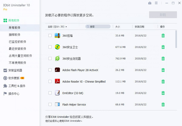 你可能会注意到你的电脑变得越来越慢,因为时间的推移。一些原因是程序无法被删除,未使用的程序,以及卸载程序的残留在内存中堆积。IObit Uninstaller 可以帮助您完全快速地卸载顽固的程序及其残留。甚至在Windows 10和Windows 8中的不受欢迎的应用程序也可以很容易删除。