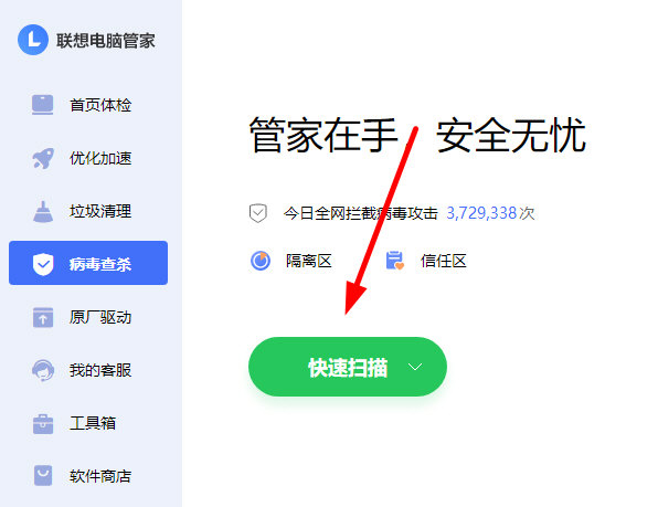 1、在主界面的“病毒查杀”界面,我们点击“快速扫描”。