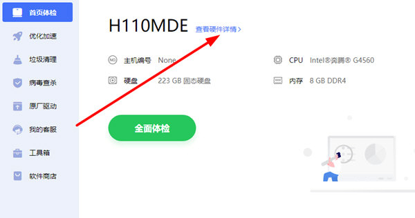 1、首先你需要进入软件主界面,点击一键体验,体检结束后出来你的系统硬件信息。然后点击【查看硬件详情】,里面就会出来你电脑中所有硬件的信息,同时稍等片刻,CPU页面、内存页面、硬盘页面就会显示出当前的温度。