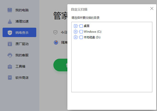 【病毒查杀】——三种模式,快速扫描、全盘扫描、自定义扫描,全面防御病毒、木马、流氓软件、流氓网站等对电脑系统和用户信息的威胁,让您安全、方便、自主、自由地使用电脑。