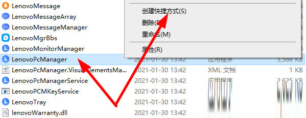 1、进入到联想电脑管家的安装目录,选择软件点击鼠标右键,然后在菜单栏上选择“创建快捷方式”选项。