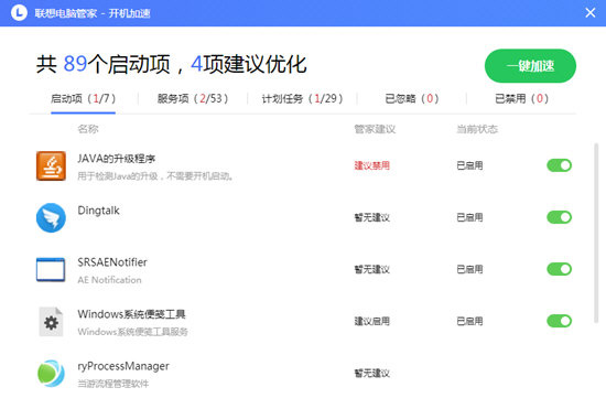 2、这就是启动项的管理界面,图方便你可以直接点击一键加速即可禁用那些无关的程序,或者有特殊程序,你可以手动选择开启。