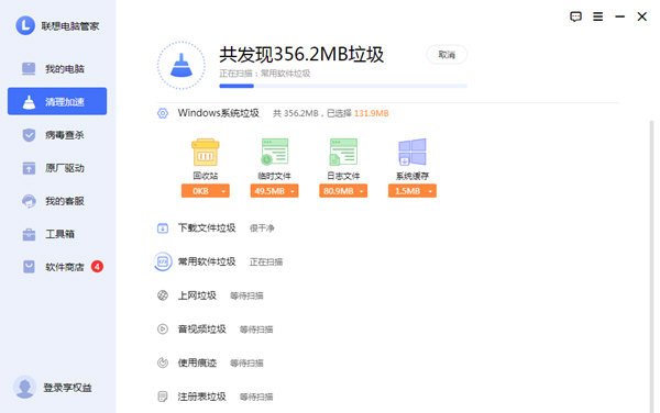 【系统垃圾清理】——在优化加速页面可进行垃圾清理和系统加速,还可进行网络测速,查看已禁止的启动项。在垃圾清理的界面通过点击图标下方的按钮查看垃圾详情,选择需要清理的垃圾选项。扫描内容包括回收站、下载目录、系统垃圾、浏览器缓存、软件垃圾、音视频垃圾、使用痕迹和注册表垃圾。