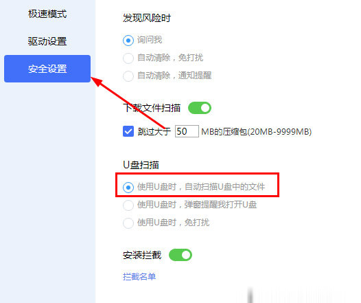 1、首先你需要在电脑管家中的设置界面中进行U盘杀毒的设置。在【设置中心】界面中,打开安全防护设置,然后菜单往下拖,选择U盘扫描中的【使用U盘时,自动扫描U盘中的文件】。下一次U盘插入到电脑中,管家就会自动扫描U盘中的文件。