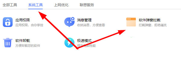 2、接着选择“系统工具”,在其中点击“软件弹窗拦截”功能即可开启广告弹窗拦截了。