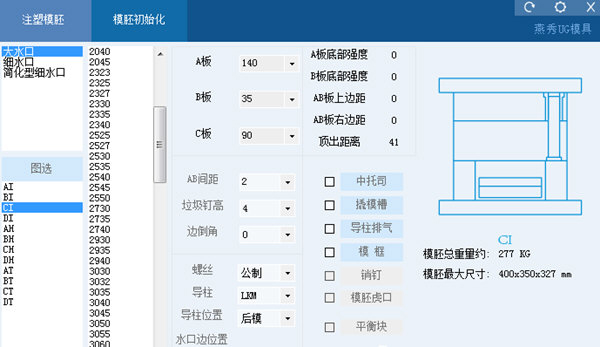 4、自动绘制,快速方便的模坯及标准件自动绘制功能,只需选择零件的型号、规格即可自动绘出零件图。模具标准零件可实现全自动绘制,无需手工绘图。