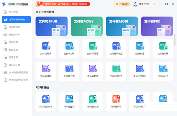 迅捷电子书转换器是一款功能十分强大的电子书文档格式转换软件,这款软件能够支持对EPUB、AZW3、MOBI等格式的电子书格式文件进行格式转换,同时还为用户提供了PDF格式转换、翻译、格式压缩等实用功能,全面满足用户对电子书的转换需求,喜欢这款软件的小伙伴千万不要错过哦。