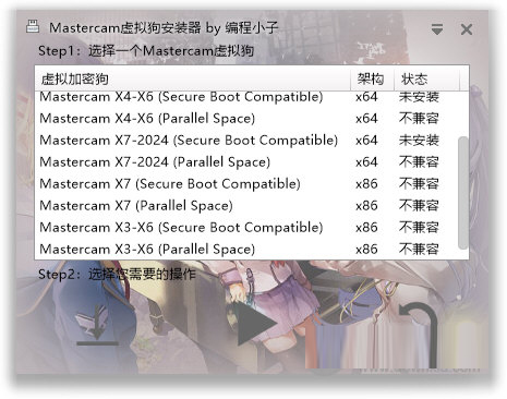根据您的Mastercam版本,选择对应的虚拟狗版本,然后在下方根据需要选择“安装/卸载”、”启用/停用”或“重启”。安装完成后即可使用软件了。
