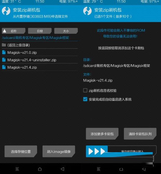 2、此时,在TWRP中点击安装,选择最新版Magisk框架卡刷包,滑动并刷入;