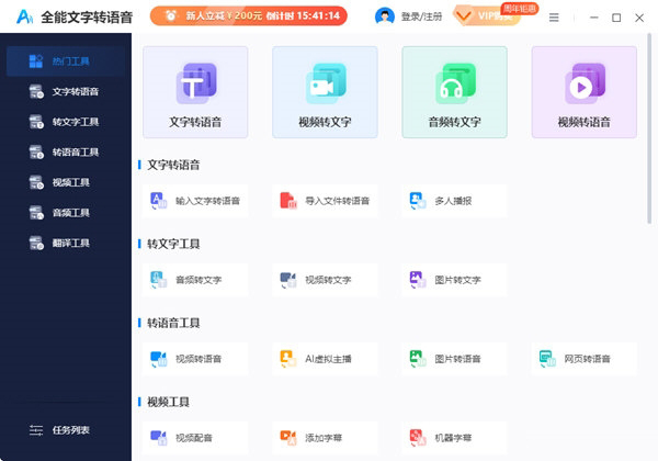 软件打开后点击左上角热门功能中的文字转语音功能