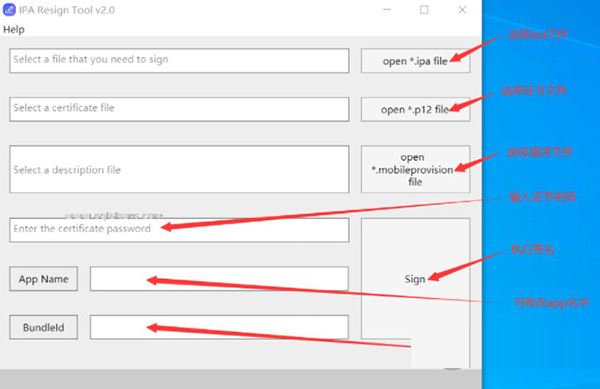 打开软件,选择需要签名的IPA文件,以及证书,描述文件,填入证书密码,如果需要修改app名字和BundleID可以在软件上进行修改,然后执行sign,完成签名。