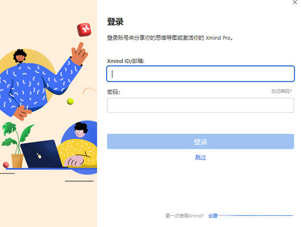 下载下来后,点击 exe 先安装 xmind,进入软件选择跳过,不要登陆