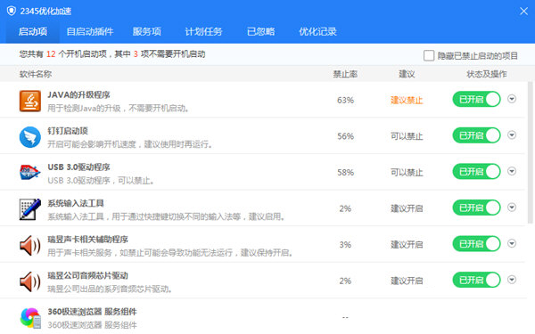 在启动项里面你就可以开启或者关闭系统的启动软件,同时也可以管理一些自启动的插件、服务项、计划任务等,一些系统的启动项目需要勾选隐藏选项来找到。