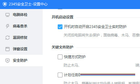 接着在设置中心里选择【安全防护】,在开机启动设置中勾选【开机时自动开启2345安全卫士实时防护】。