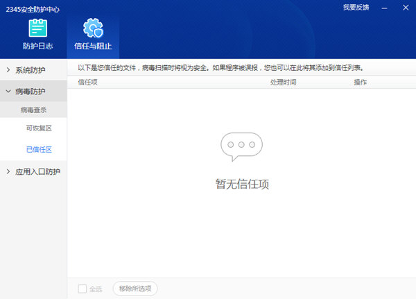 你的一些文件不想被查杀,那么你可以将其添加到白名单,我们进入【病毒查杀】栏目,然后选择【信任区】。