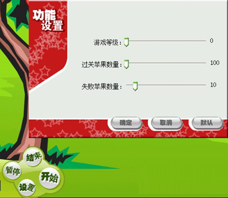 开始游戏前,你可以先进行设置,在里面可以设置游戏等级、过关苹果数量、失败苹果数量。游戏的等级越高,苹果的下落速度也就越快,苹果掉在地上就算失败,你可以设置失败数量来提升你的容错率。