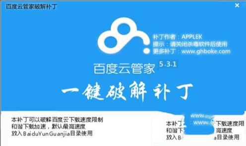 1、首先安装安装原版百度云管家2、把一键破解补丁放入BaiduYunGuanjia目录使用