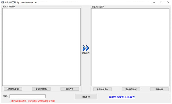 4、支持设定自定义加解密密码,设置高强度密码并妥善保管即可确保加密的内容无法轻易还原为原始内容,保护原始内容的访问安全,同时只需要将密码及本软件发送给任何人即可顺利解密出原始内容,方便使用。