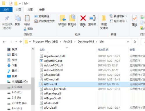 将Crack文件夹中的AfCore.dll文件复制后,粘贴到ArcGIS Desktop 10.8软件的默认安装路径D:\Program Files (x86)\ArcGIS\Desktop10.8\bin文件夹中替换同名文件,