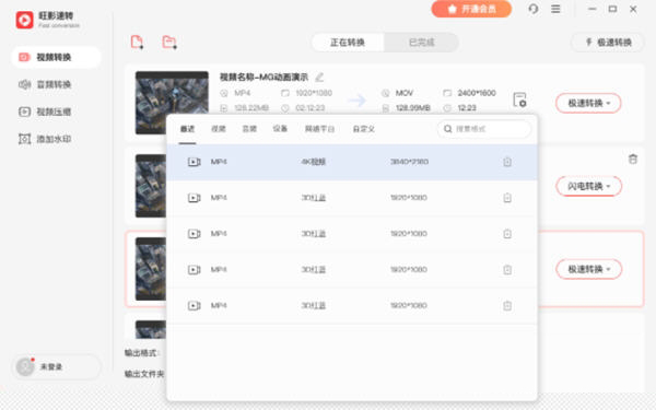 1.视频转换:旺影速转支持常见的MP4/AVI/MOV/MKV等格式同时也支持国内主流和特殊的视频格式转换。