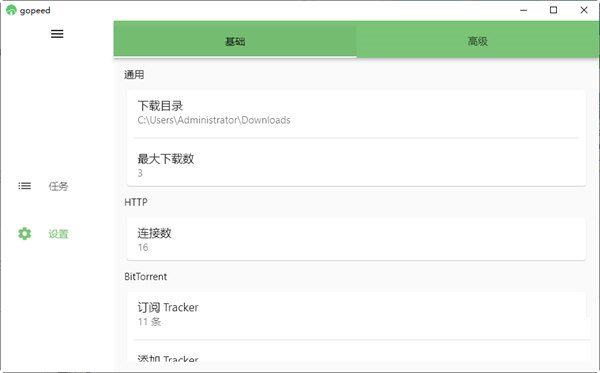 打开Gopeed后可以在【设置】界面设置默认下载目录,像下载的连接数以及用于Torrent下载的Tracker也可以设置。最高线程数能达到256,反正以2的n次方设置都可以。