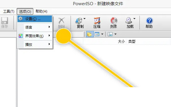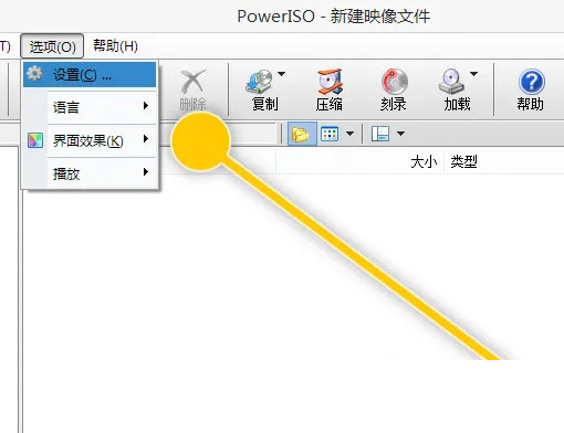 在“PowerISO”主界面中,点击“选项 > 设置”菜单项。