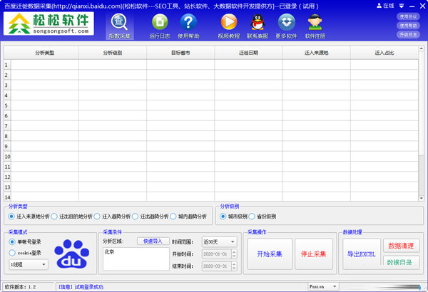 百度迁徙数据采集工具是一款可以帮助用户采集相关数据的应用软件,支持批量采集迁入来源地分析、迁出目的地分析、迁入趋势分析、迁出趋势分析、城内出行强度分析等多种格式的数据。