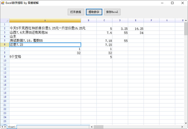 Excel数字提取工具由吾爱网友开发,适用于提取A列中文本数字混合在一起的数字,如果你某一列内容中有汉字有数字,并且有多组数字的情况下,如"今天5千克西红柿的单价是3.25元一斤总价是16.25元",那么就可以把这三个数字都提取出来,依次放入后面的列中。