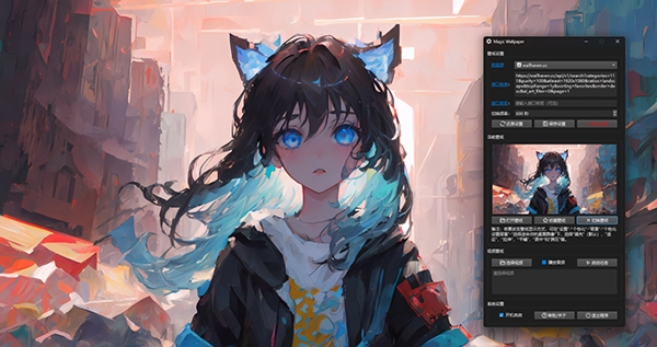 1、图片壁纸功能:由 https://wallhaven.cc/ 官方提供的 API,自动获取并定时切换图片壁纸。已默认配置了接口链接(下载分辨率 1080P 以上的图片)和切换频率(600 秒,即 10 分钟),接口链接可以按照下图的方式来自定义。