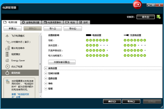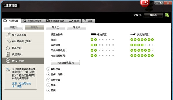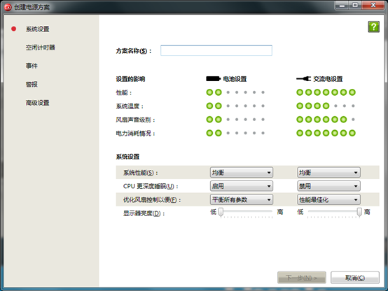 点击“新建”后,Power Manager会跳出电源缺省方案选项卡,在“方案名称”里输入所编辑的电源方案名称,随后在选项卡“系统设置”里分别选择“电池设置”与“交流电设置”的相应设置即可。