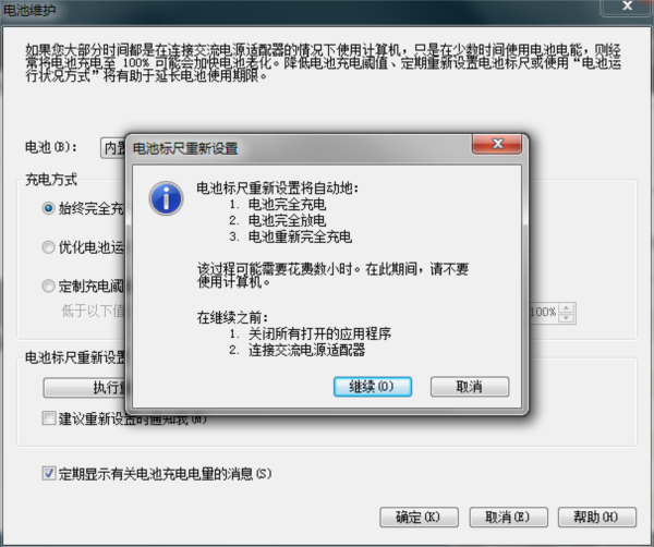 在“电池维护”选项卡中,“执行重新设置”按钮是对电池标尺重新设置,跟随软件相应的提示,经过几次确认后即可开始对电池进行电池容量重置过程。