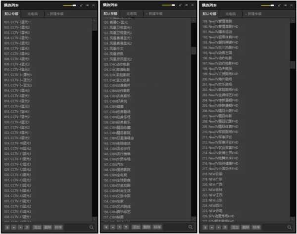 央视+各省:基本上包括了央视全套的高清频道和国内各个省级的卫视。地方频道:主要是各个省的地方频道,按照省份排列,内容有些多和杂,质量也层次不齐,这个主要是方便大家按照兴趣组合。港澳台:搜集整理的香港台湾和澳门以及一些海外华人频道,其中包括凤凰卫视、TVB、星空等一些深受大家喜欢的频道。特色频道:主要包括了一些影视轮播、NewTV、CHC等特色频道