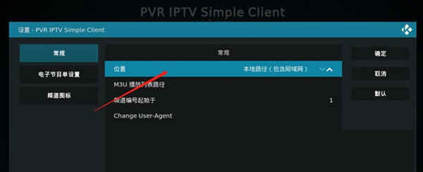 四、在【PVP IPTV Simple Client】插件中点击设置,在常规选项中可以看到“位置”选择本地路径(包含局域网)接着点击位置下方的M3U播放列表路径,点击之后就能看到我们刚才插入的U盘,点击进入U盘,找到我们放入U盘的直播源文件,点击确定就已经添加完成了。
