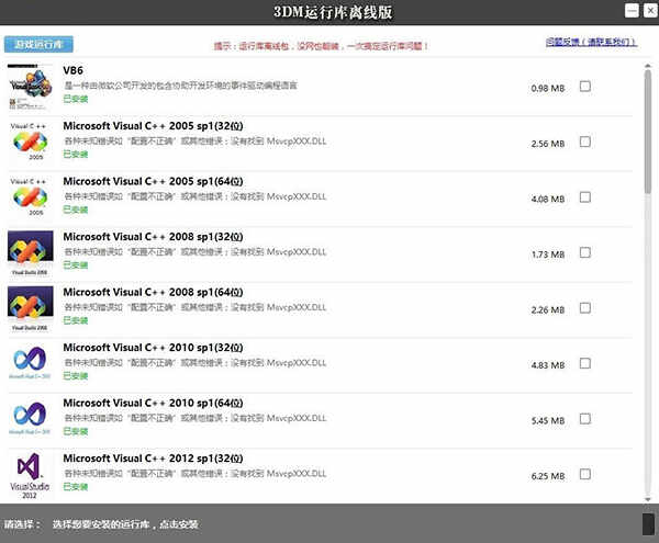 3DM游戏运行库合集离线安装包部分组件的安装需要管理员权限,如果安装失败可用右键使用管理员账户下运行本工具。安装.Net时间较长,请耐心等待.Net4.6包含4.0、4.5.x,XP下安装方法可以见软件内说明。本程序安全无插件,安装过程如遇安全软件拦截,请先退出安全软件。本合集含最新最全的运行库与组件,但针对不同的系统显示不尽相同。