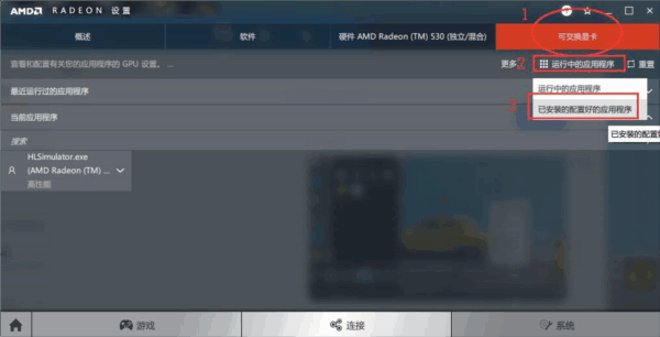 二: AMD显卡驱动设置界面如下图,点击下图右上角的可交换显卡-运行中的应用程序-已安装的配置好的应用程序按钮。
