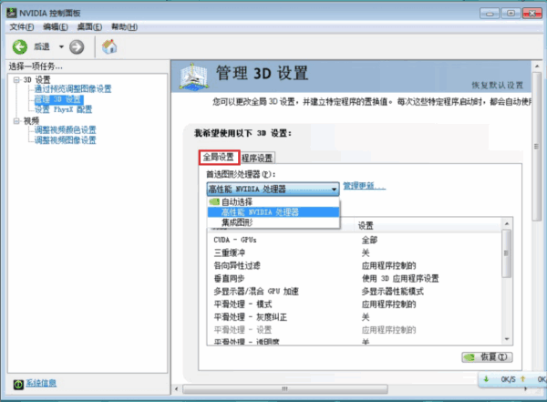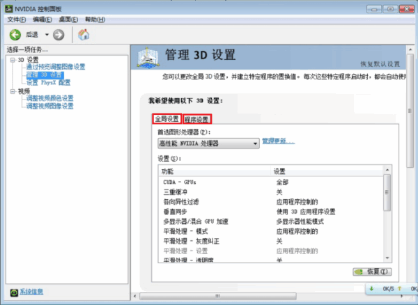 二:进入“NVIDIA 控制面板”,查看全局设置。