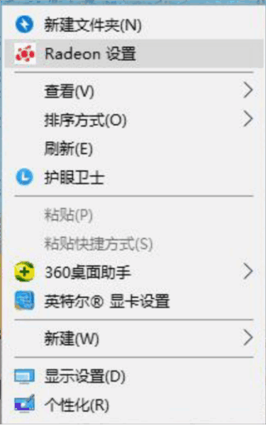一:在桌面打开右键菜单,选择“Radeon设置”(某些显卡也显示为配置可交换显示卡。)