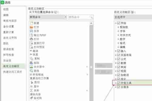 3、我们打开Excel的工具栏,选择自定义功能区域后,选中自定义功能中的开发工具以启用开发工具。