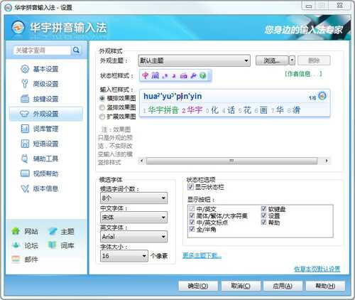 在输入法设置工具中,输入法设置>>外观设置提供了多种外观设置选项。