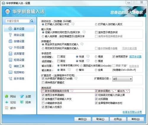 如果只想在数字后面输出中文标点,则在“设置”->“基本设置”选择“数字后面跟随英文符号”选项。