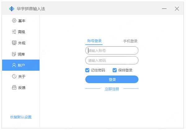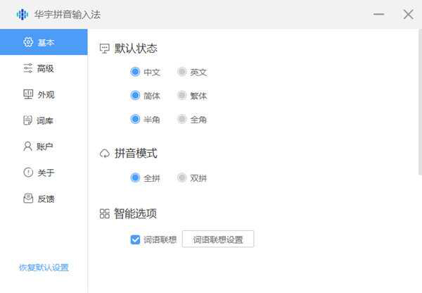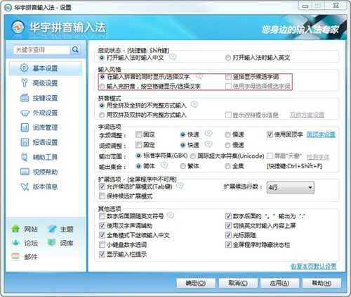 中文标点符号 / 英文标点符号状态切换设置,提供华宇拼音输入法设置,包括常用显示设置、字频词频设置、词库的添加、智能选项设置、输入模式设置、自定义短语等