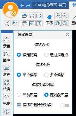 点击进行偏移设置,默认指定距离进行偏移,偏移个数为单个偏移,偏移对象图层为源对象图层,偏移后不删除源对象,修改选项后,记住上次的选择。