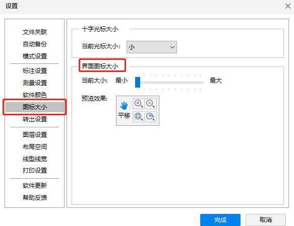 点击左上角设置-图标大小界面图标大小-可拖动标尺,实时预览效果,选择合适的大小,注意更改后需要重启软件生效