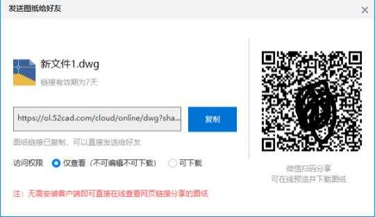 点击分享图纸,默认访问权限为仅查看(不可编辑不可下载),也可选择可下载(可编辑可下载)
