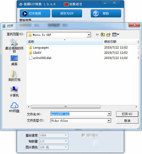 点击“打开视频”按钮,选取视频文件。视频GIF转换支持各种常用视频格式,如:AVI, mpeg, MP4, WMV, MKV, MOV, VOB, RMVB等。