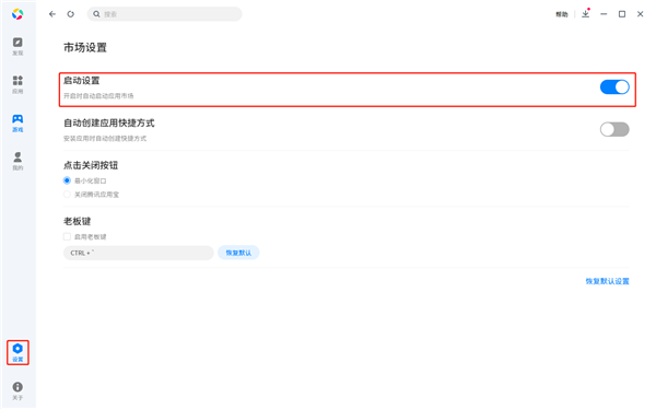 1、应用宝在设置中选择启动设置,勾选“开启时自动启动应用市场”