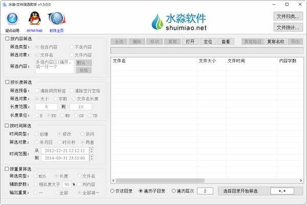 水淼文件筛选助手是一款绿色小巧、简单易用的文件筛选软件,它的功能就是帮助用户快速从大量文件中自定义多条件然后筛选出指定的文件,可设置条件为某个关键字、文件创建日期等。比如说想找出包含有某关键字的文件,想找出某个时间范围内使用过的文件,想找出某个长度范围内的文件,想找出重复的文件,等等都可以使用本筛选助手轻松搞定!